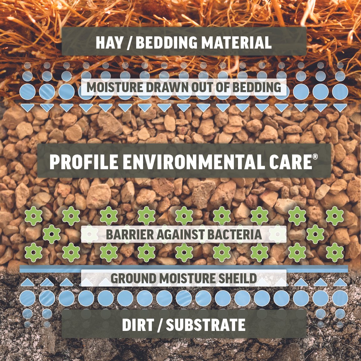 Profile forms a porous mineral layer beneath the bedding that actively draws moisture out of the bedding above it. This helps reduce ammonia odors, limit bacterial growth, and improve overall stall air quality.